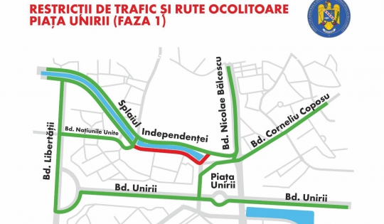 În acest context, conducătorii de vehicule care au ca destinație Piața Unirii vor avea ca traseu alternativ: bd. Libertății - Piața Constituției- bd. Unirii.