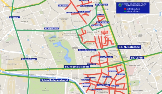 Pe durata restricțiilor instituite se va permite traversul pe Calea Victoriei, la intersecțiile cu Bd. Dacia, Str. Știrbei Vodă, Str. George Enescu, Str. Ion Câmpineanu și Bd. Regina Elisabeta .