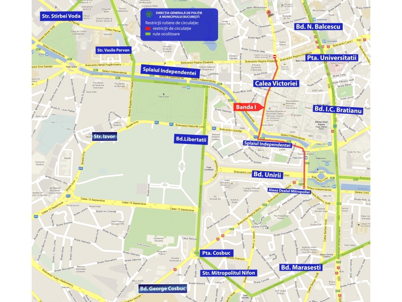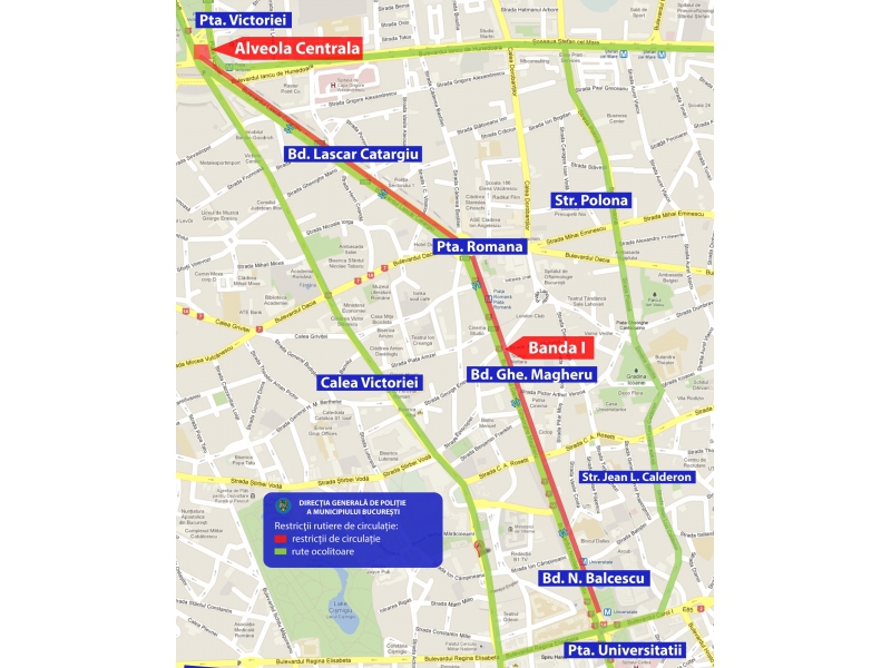 I. între orele 15.00-16.30, deplasare pe banda I de circulație pe traseul: trotuarul aferent Teatrului Național, din Bd. Nicolae Bălcescu – Bd. Gheorghe Magheru – Piața Romană – Bd. Lascăr Catargiu – Piața Victoriei – alveola centrală;