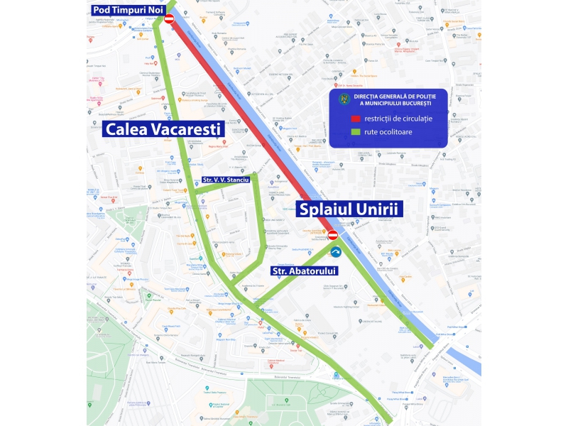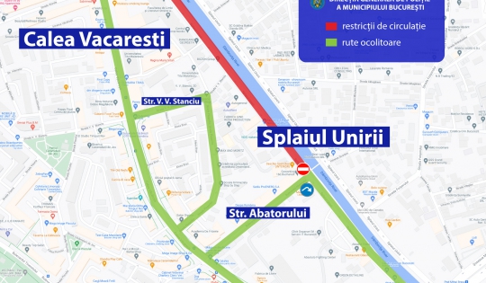 Pentru buna desfășurare a evenimentului, în perioada 22 septembrie a.c., ora 19.00 – 25 septembrie, ora 06.00, se va restricționa traficul rutier pe Splaiul Unirii, segmentul de drum cuprins între Pod Timpuri Noi și str. Abatorului.