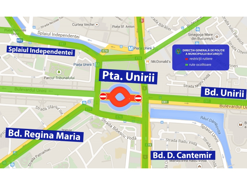 Pentru buna desfășurare a evenimentului, în perioada menționată mai sus, între orele 19.30 – 21.30, se va restricționa traficul rutier, gradual, în funcție de numărul de persoane, pe Bd. Unirii, segmentul cuprins între Bd. Dimitrie Cantemir și Splaiul Independenței (zona fântâni).