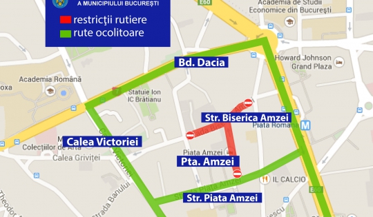 Pentru buna desfășurare a evenimentului, începând cu data de 14.07.2023, ora 14.00 și până la data de 15.07.2023, ora 01.00, se va restricţiona traficul rutier pe Str. Biserica Amzei, segmentul de drum cuprins între intersecția cu Str. Mendeleev și intersecția cu Str. Cristian Tell, precum și pe trotuarul din Str. Piața Amzei – legătura cu Str. Biserica Amzei.