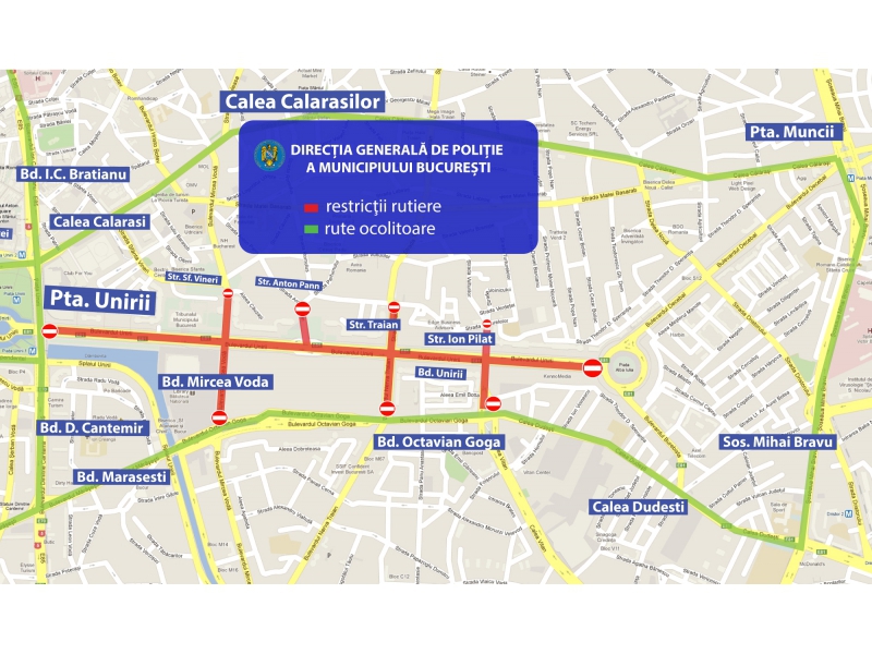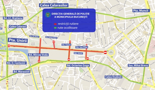 Pentru buna desfășurare a evenimentului, între orele 12.00 – 18.30, se vor institui restricții de circulație pe următorul traseu, precum și pe străzile care acced în acest tronson.