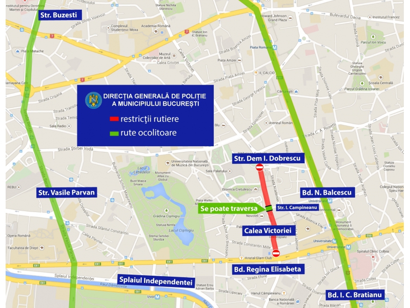 Pentru buna desfășurare a evenimentului, în perioada 21 – 23 aprilie a.c., între orele 19:00 – 23:00, se va restricționa traficul rutier pe Calea Victoriei, segmentul cuprins între Bd. Dacia și Bd. Regina Elisabeta, fără afectarea intersecțiilor (se va permite traversul auto pe la intersecția cu Str. Ion Câmpineanu).