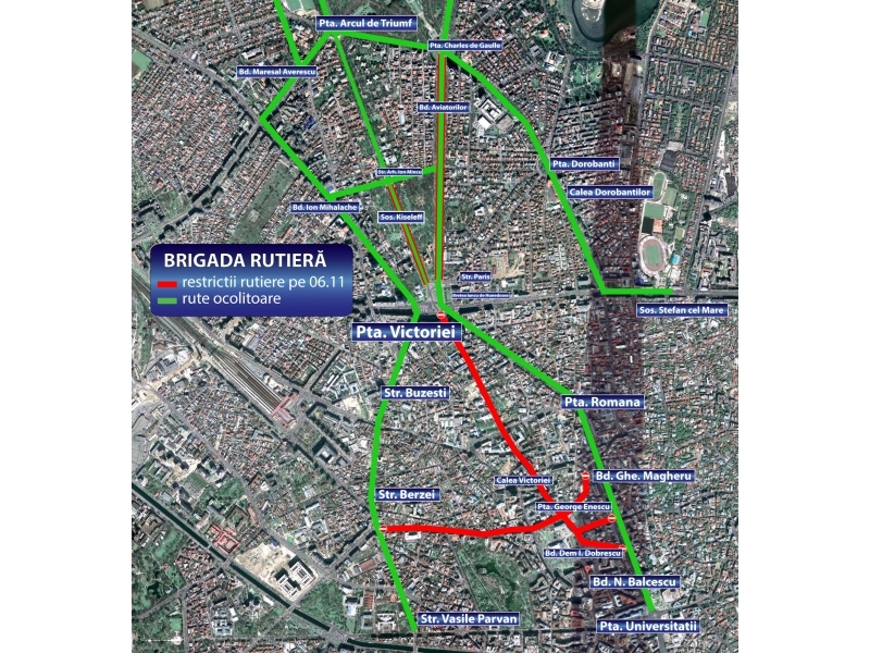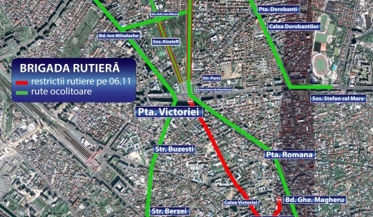 - pe Calea Victoriei, între Piața Victoriei și Dem. I. Dobrescu. Se va permite traversul pe Calea Victoriei în următoarele intersecții: Str. Sevastopol, Str. Ghe. Manu, Bd. Dacia, Calea Griviței (care va fi restricționată de la intersecția cu Bd. Dacia)